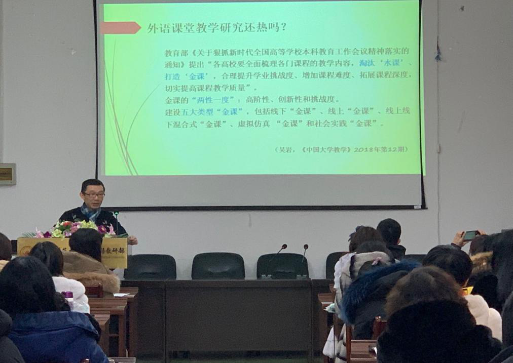 (张茵楠/文)为贯彻落实我校2019年度国家社科基金申报辅导工作,提高外语学科的申报质量,提升教师科研水平,加强研究生学术素养,1月7日上午,我校公共英语教研部特邀上海外国语大学博士、山东大学外国语言文学博士后杨港教授,在109会议室举行外语学科2019年度国家社科基金申报学术讲座。公共英语教研部主任顾世民主持了本次讲座,部党委书记王淑杰、副主任才亚楠以及英语部全体教师、部分研究生参加了此次讲座。东北林业大学等省内其他高校教师、我校其他外语院系的部分师生也前来参加了本次辅导讲座。