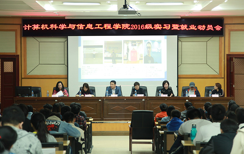 (王明华/文)为更好地落实2016级专业实习工作,提高学生实践创新能力,推进学院更高质量和更充分就业。计算机科学与信息工程学院于5月8日下午在图书馆召开了2016级专业实习与就业动员大会。学院领导班子全体成员,系主任,教科办、学工办相关人员及2016级全体学生参加了本次会议。