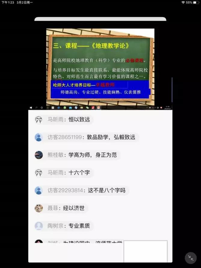 在我校线上教学“一院一策”、“一课一案”的总体部署之下,公共课教师开展了“和而不同”的特色课堂教学研讨。同样的教学大纲,同样的教学进度,混合式教学中同样的慕课选取,却有着不同的教学方法与教学组织形式。老师们充分发挥各自教学优势,建设特色教学,共享教学心得体会,从直播教学的课程内容到关注教学过程中声音语调与网络延迟,根据反馈及时作出相应的调整。对于直播教学中如何发现问题以进一步有效组织教学,马克思主义学院、教育科学学院教师面对慕课平台拥堵的情况,果断启用预案,通过钉钉、腾讯课堂、微信群等进行直播教学,为开学第一课给出了最好的“答案”。