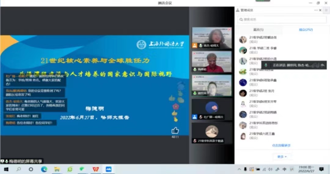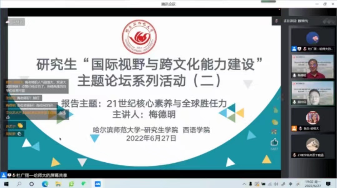 (陈杰 于晓涵/文)2022年6月27日,研究生学院和西语学院邀请上海外国语大学梅德明教授就“21世纪核心素养与全球胜任力”作学术报告,西语学院院长顾世民主持报告。本次学术报告吸引了国内30多所院校700余名教师、学生参加,论坛反响热烈。