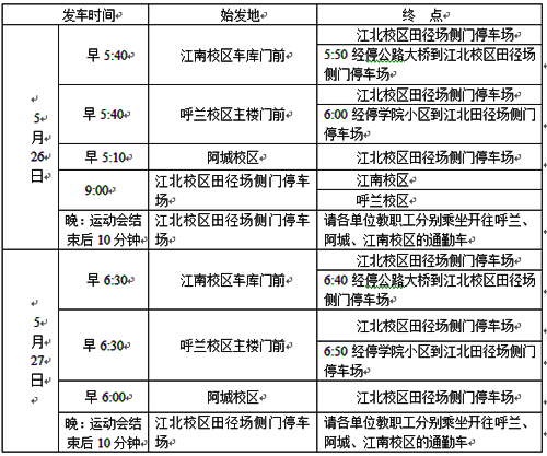 学校将于5月26日至27日召开运动会,届时学校通勤车将按如下时间发车,请各单位提前做好准备。