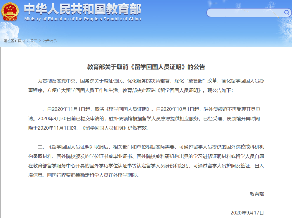 9月17日,教育部官网发布公告(http://www.moe.gov.cn/jyb_xxgk/s5743/s5744/A20/202009/t20200917_488440.html),决定自2020年11月1日起,取消《留学回国人员证明》。具体内容如下: