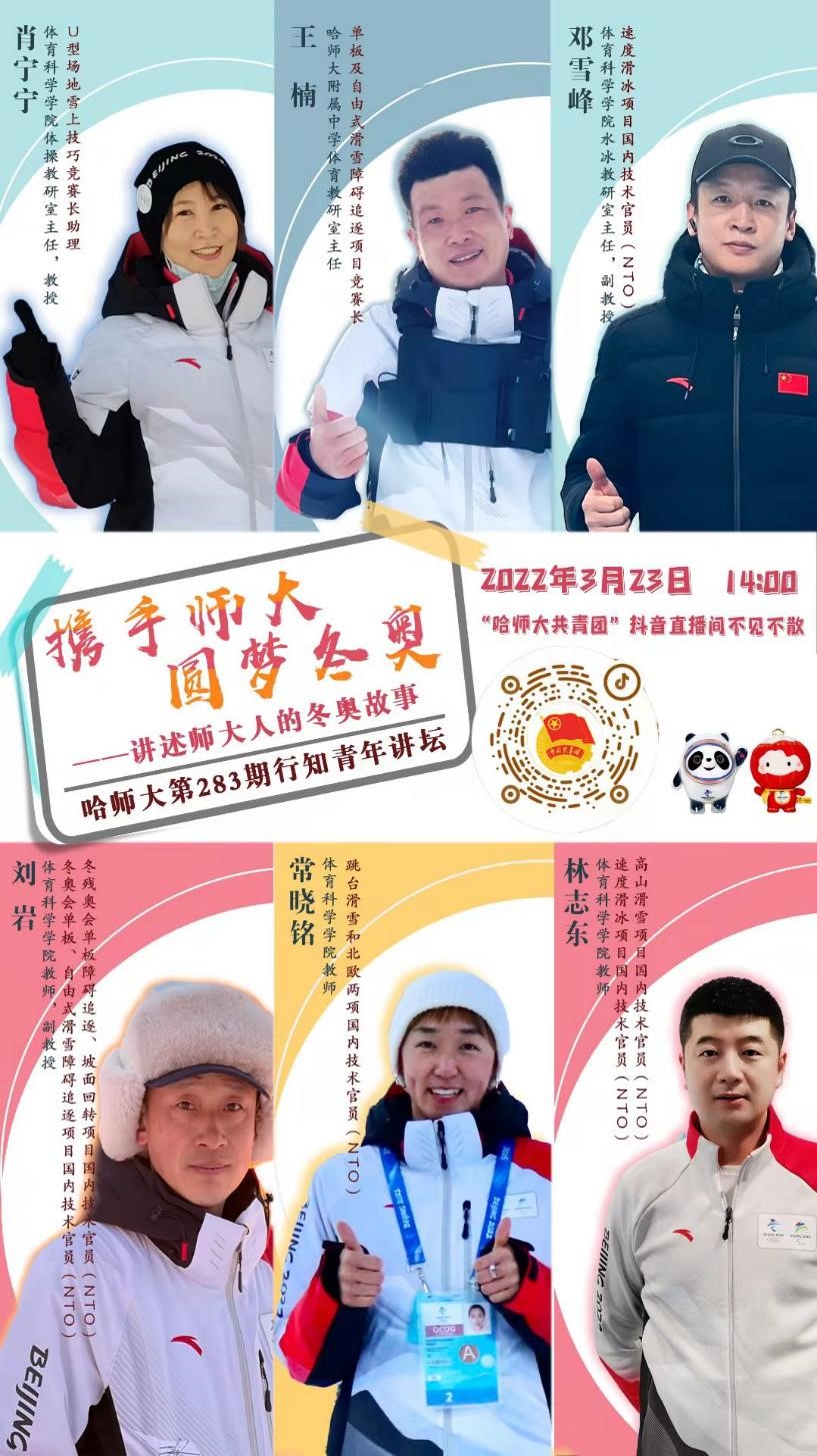 在前不久结束的北京冬奥会和冬残奥会上,我校多名教师担任赛会部分项目国内技术官员,贡献了师大力量,为哈师大赢得赞誉。为让广大师生感受冰雪魅力,享受运动快乐,现邀请其中部分教师参加第283期行知青年讲坛活动,现场分享师大人的冬奥故事,现将相关事宜通知如下:
