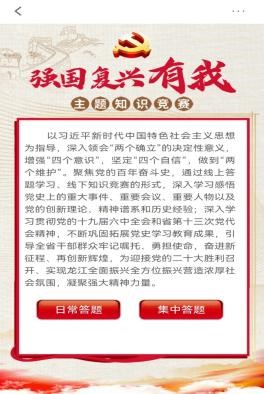 即日起,“龙头新闻”、“极光新闻”APP开通“强国复兴有我”主题知识竞赛专题页面,全体师生可“实名”注册或以“访客”身份登陆答题系统进行答题。线上答题阶段分为日常答题和集中答题2个部分。