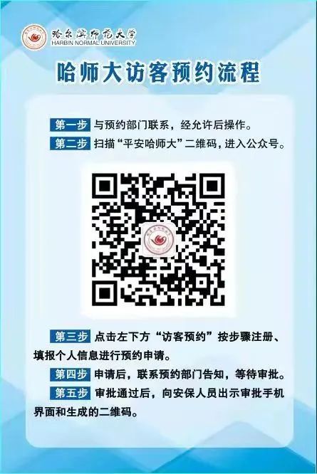3.外来人员(进校培训、施工等)确需入校的,须持48小时内核酸检测阴性证明,通过“平安哈师大”微信公众号的“访客预约”小程序进行入校预约,按照“谁审批、谁负责”的原则,由受访单位工作人员“点对点”接引入校。