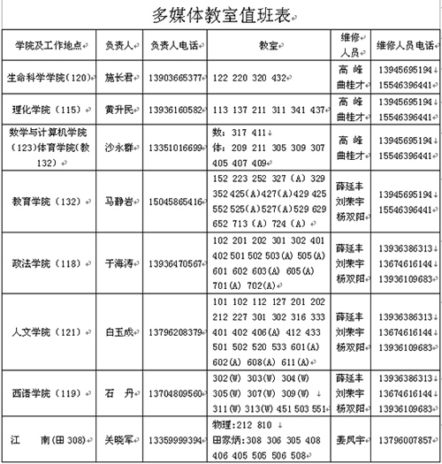 在新学期到来之际,祝您工作顺利。由于假期对江北校区60间和江南校区11间多媒体设备进行了升级改造,致使部分多媒体设备使用方法发生了改变。为保证多媒体教学的需要,我处全员在开学第一周为上课教师使用多媒体设备提供咨询和服务,现将值班表公示如下: