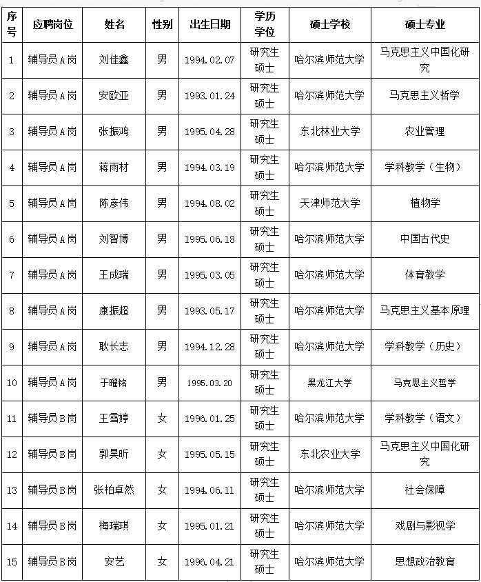 按照《黑龙江省事业单位公开招聘工作人员实施细则》的规定,根据《拼搏在线登录2019年下半年公开招聘辅导员公告》招聘的原则、程序和方法,经拼搏在线登录校长办公会审定,现将拟聘用人员予以公示,公示期为7个工作日(2020年1月3日-2020年1月13日)。如对拟聘用人员有异议,可在公示期内反映,反映情况和问题必须实事求是,应签署或告知真实姓名、工作单位和联系方式;对线索不清的匿名信和匿名电话,公示期间不予受理。