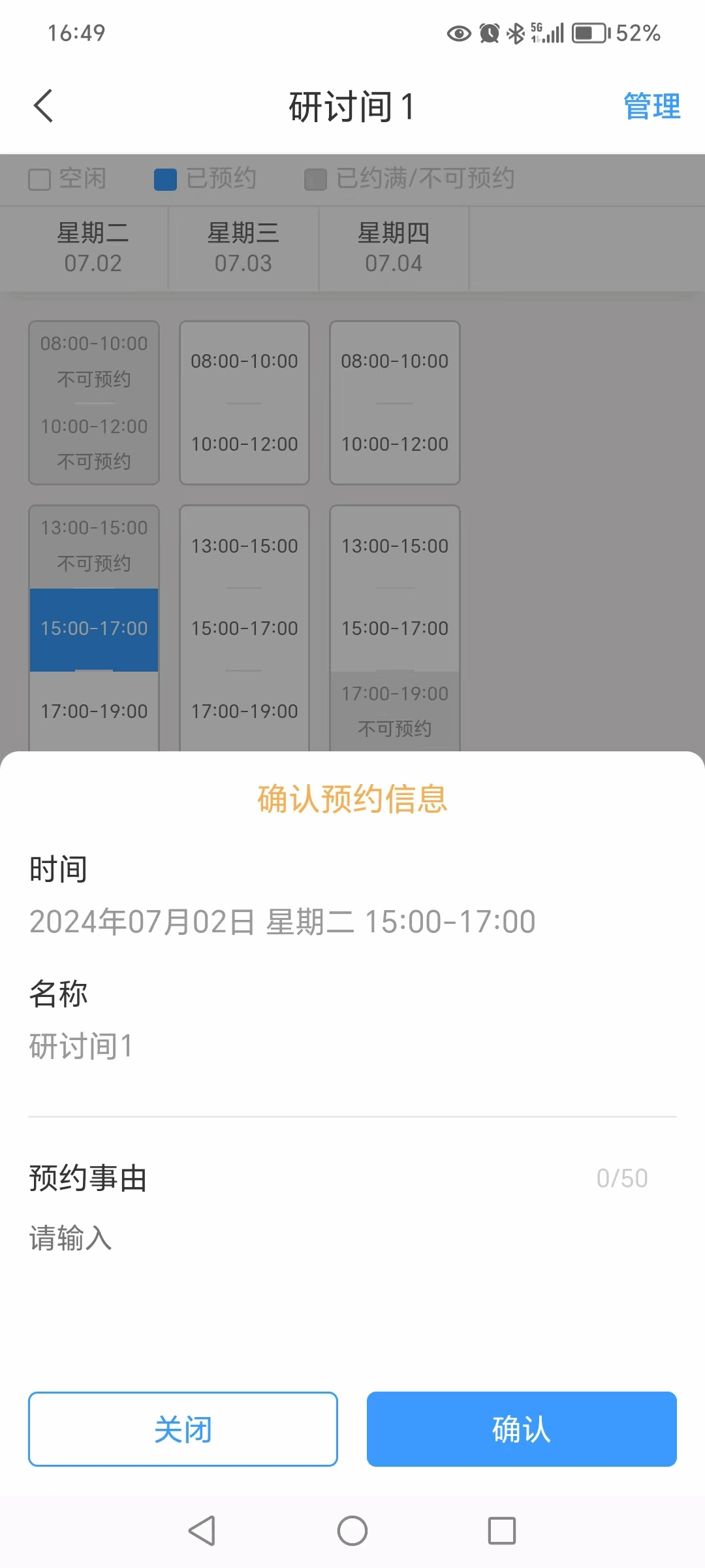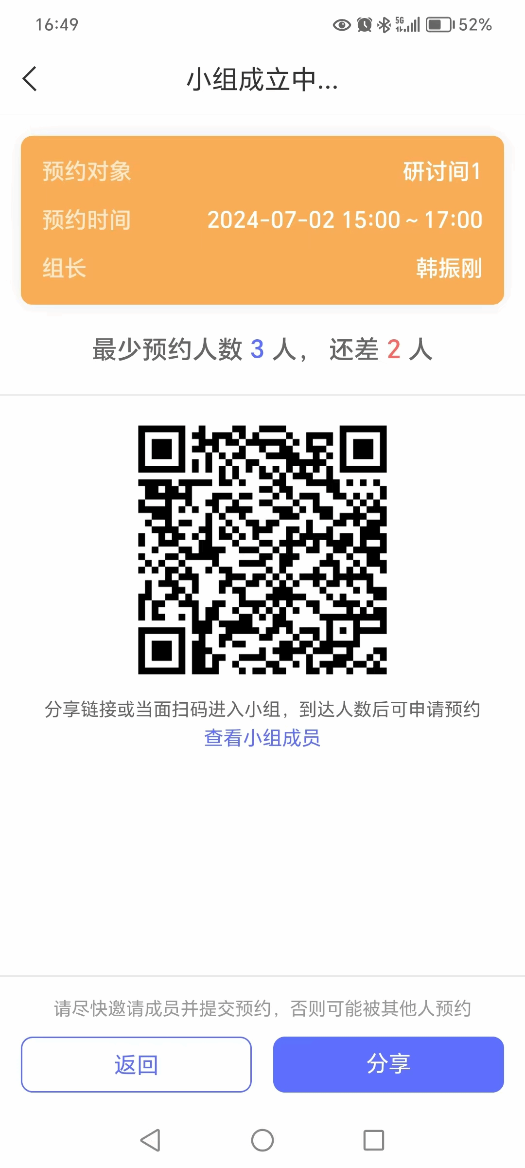 3. 预约成功后,应在约定时间到达研讨间并扫码签到。如无法赴约,需提前登录系统删除预约。