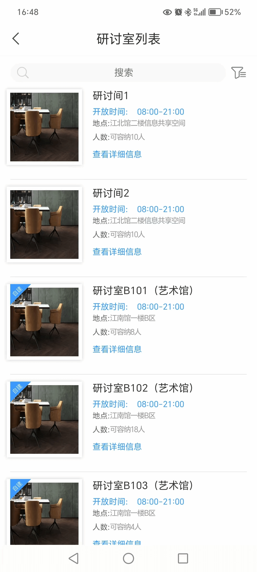 为方便我校师生研究、讨论和小型会议等活动的开展,图书馆现为读者提供团体研讨间6间。其中江北馆2间,江南馆4间。研讨间具体情况如下: