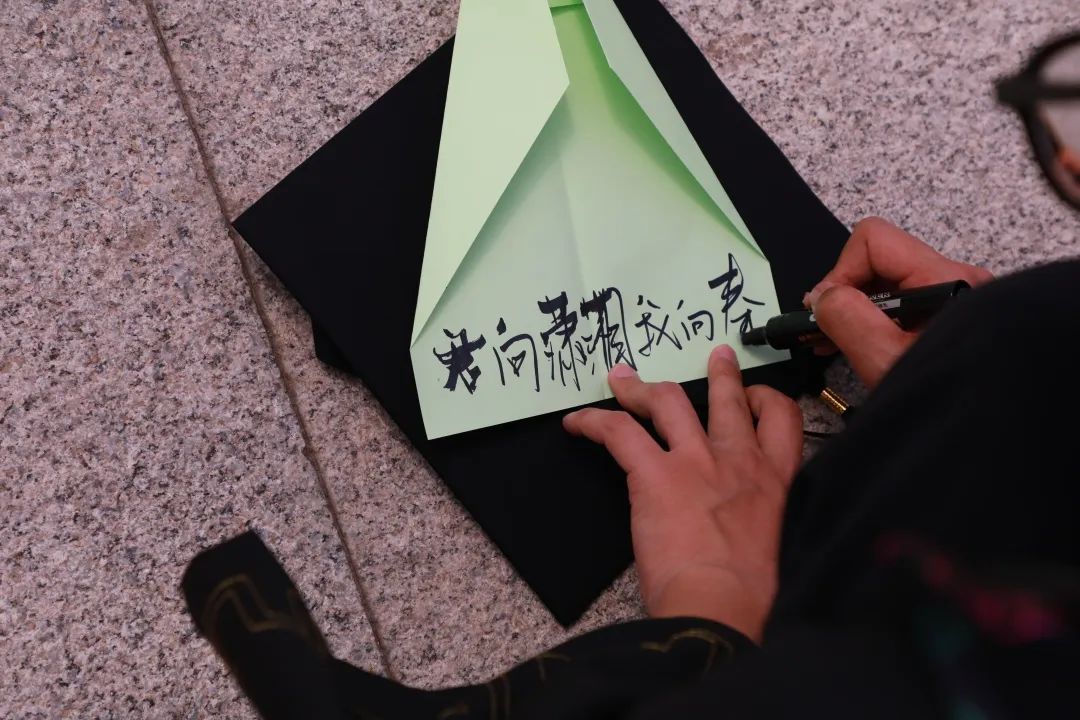毕业生在行知楼南广场上将梦想写在彩纸上,折成纸飞机,纸飞机平稳的飞翔,即将抵达梦想的彼岸。不管梦想是否能够实现,至少在这一刻,是怀揣着梦想的我们。