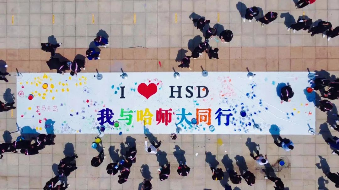 毕业生在背景板上为“我爱哈师大”涂色,把自己的手印按在背景板上。每个人的手掌都是独一无二的,按下手印,把自己独特的印记留在哈师大。