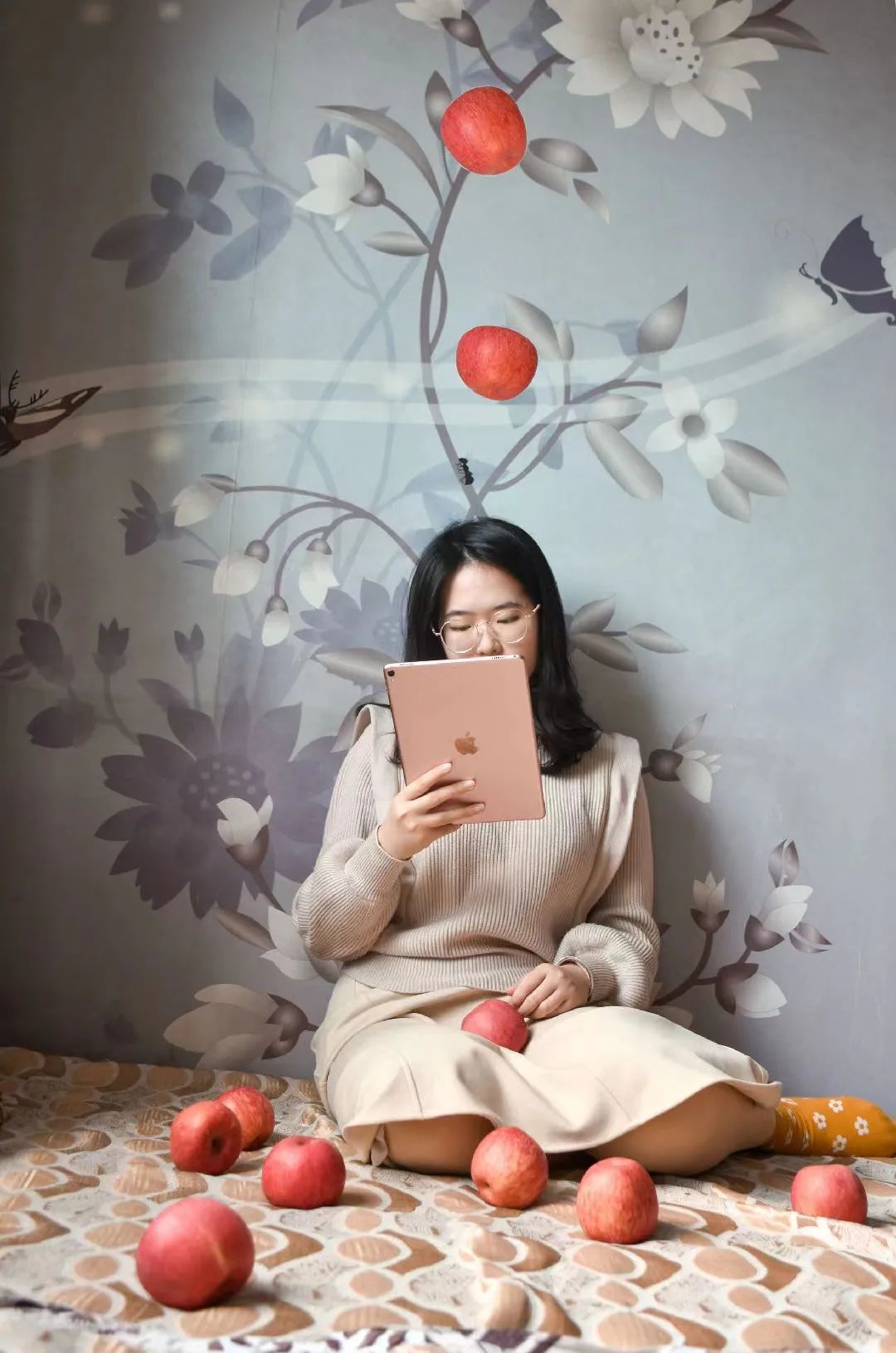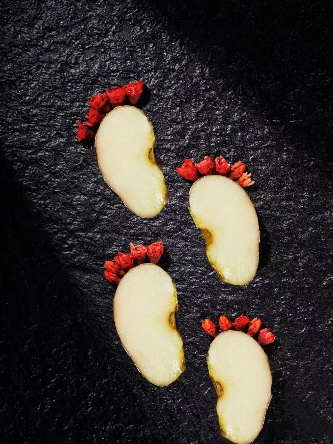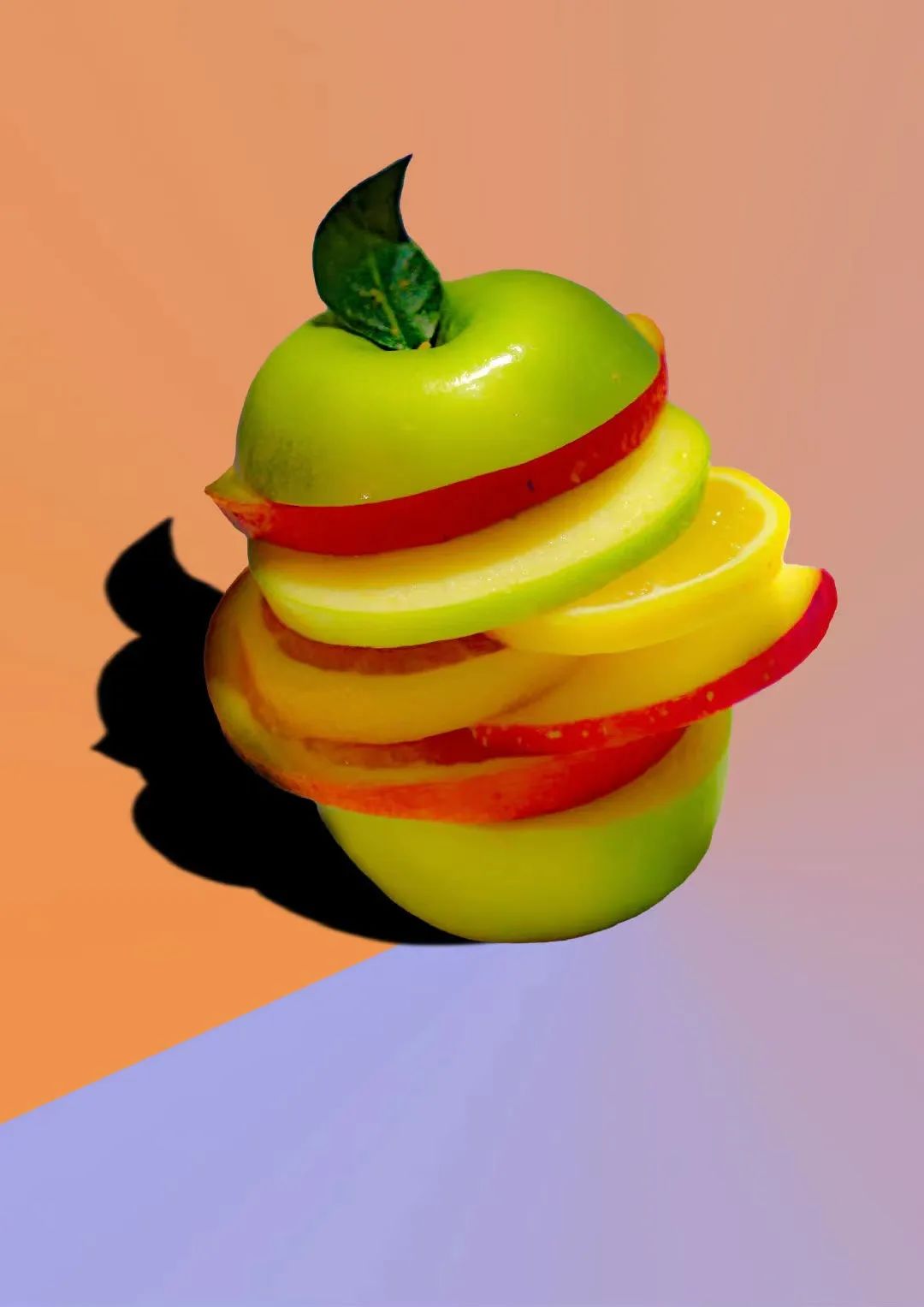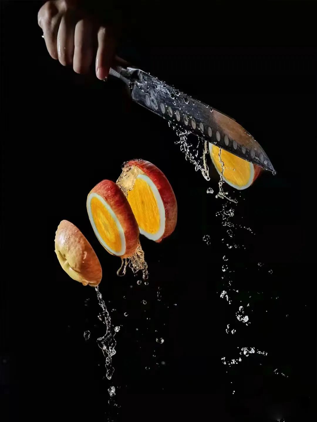 三、以“苹果”为素材的创意摄影苹果,是人们日常生活中经常购买和食用的一种常见水果。苹果因“苹”与“平”同音,因此也被人们称为“平果”。人们看望亲朋好友或去医院看望病患时,带来的水果中一定有着苹果的身影,因为苹果不但含有丰富的维生素和蛋白质,而且也寓意着平平安安、健康长寿,象征着平安和幸福生活的到来。此外,不同颜色的苹果也有着不同的象征寓意,红苹果象征着爱情与平安幸福,黄苹果象征着珍重祝福,绿苹果象征阖家欢乐与幸福团圆……2022届学生们将自己对于“苹果”的理解与思考,结合创意灵感与专业技能进行表达。下面一组以“苹果”为素材的创意摄影作品进行展示。