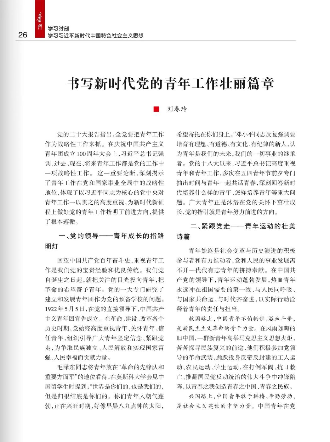 党的二十大报告指出,全党要把青年工作作为战略性工作来抓。在庆祝中国共产主义青年团成立100周年大会上,习近平总书记强调,过去、现在、将来青年工作都是党的工作中一项战略性工作。这一重要论断,深刻揭示了青年工作在党和国家事业全局中的战略性地位,体现了以习近平同志为核心的党中央对青年工作一以贯之的高度重视,为新时代新征程上做好党的青年工作指明了前进方向,提供了根本遵循。