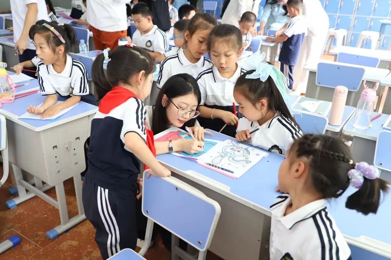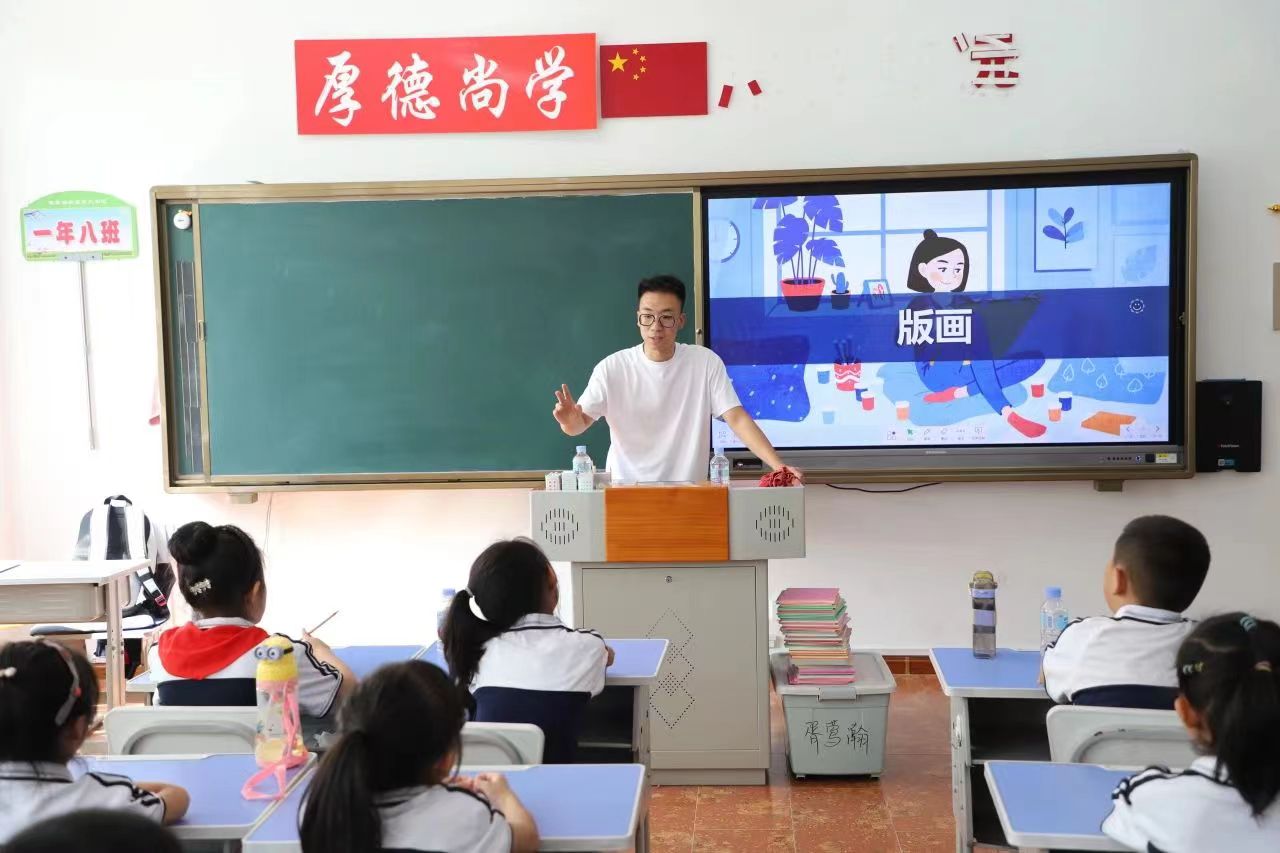 授牌仪式结束后,研究生和本科生党员代表为哈尔滨新区第六学校的学生讲授生动的版画课程,并让学生们参与到制作版画的实践教学中,孩子们纷纷选择自己喜欢的卡通人物进行创作,课堂气氛热烈。