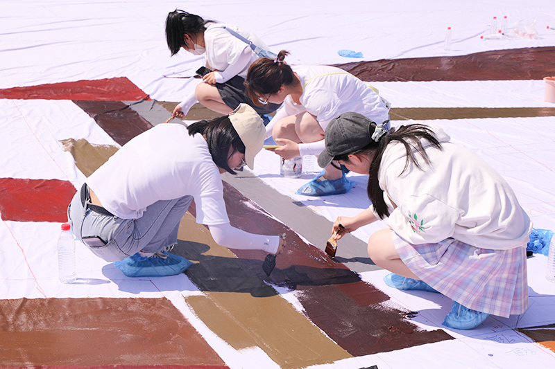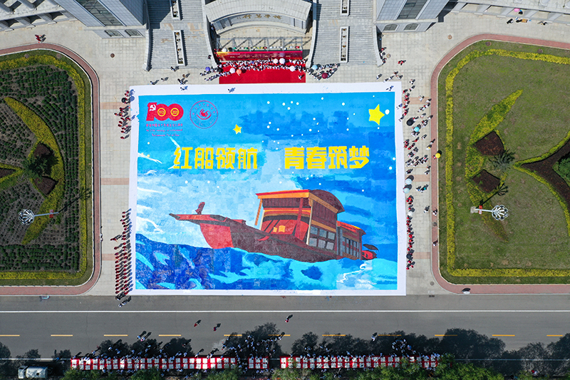 活动中,校领导与师生共同参与到书画创作中,师生们齐心合力,团结协作,充分发挥专业优势和师范特色,以过硬的专业技能完成100幅红色题材书法作品和2000平方米的巨幅画作《红船》,用画笔描绘红船精神、用水墨书写青春梦想。生动壮阔的创作场景,同学们无畏炎炎烈日和创作艰辛,用实际行动体验红船精神,用青春和活力彰显师大学子的朝气蓬勃,共同完成了一堂红色书画主题创作“思政大课”,展现了新时代青年勇立潮头、敢为人先、坚韧不拔的人生信念。活动最后,全体师生共同唱响《星辰大海》,共同祝愿百年红船劈波斩浪、行稳致远。