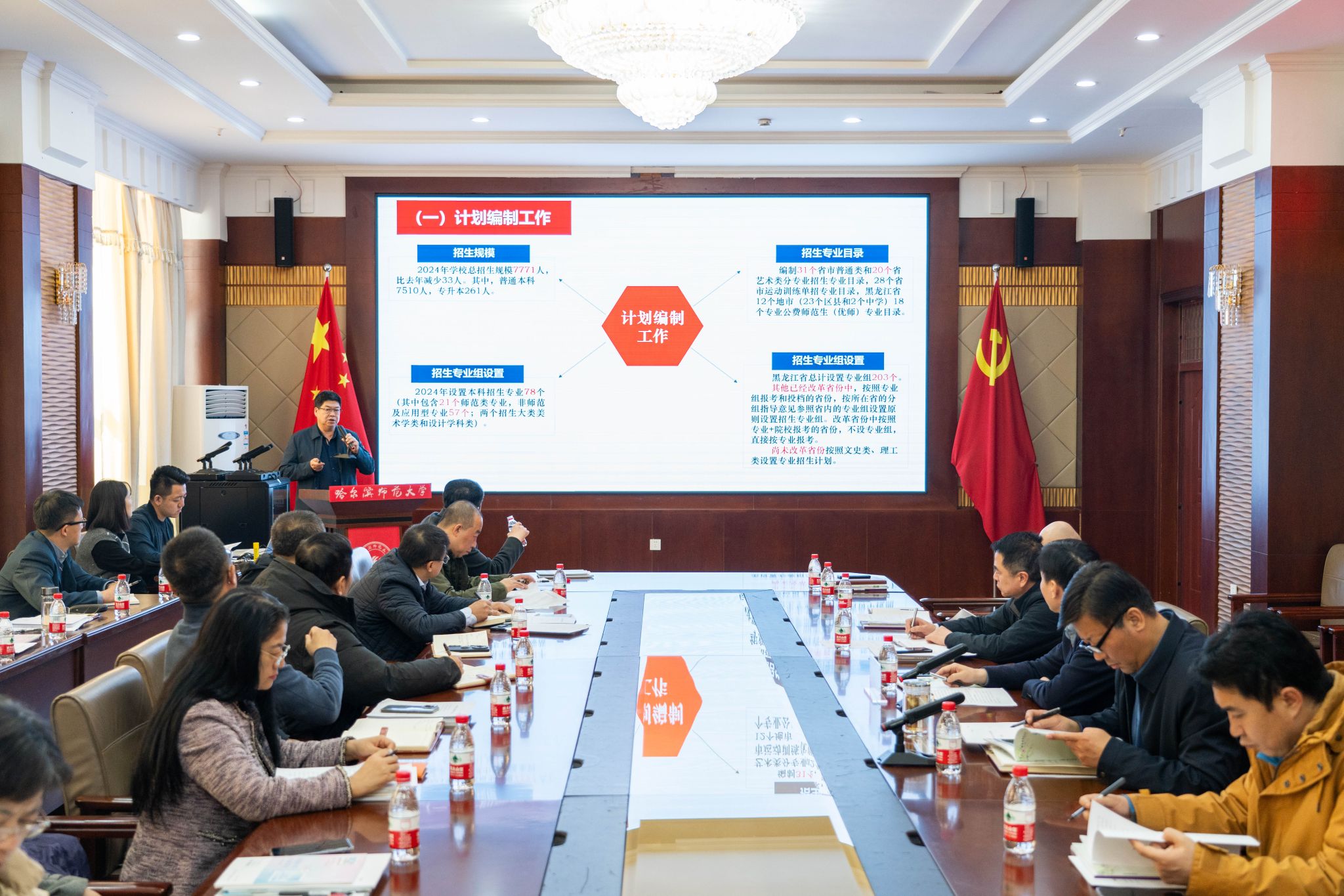 蒋鲲充分肯定学校2024年本科招生工作成效,围绕“危机意识、改革突破、系统联动、扩大宣传”对学校2025年招生工作提出四点要求:一是优化专业布局与内涵建设。面对高考综合改革和学科专业调整的“双重挑战”,学校要明确专业选才方向,加强品牌专业、特色专业建设,充分发挥师范专业优势,促进专业交叉融合,形成专业发展新格局。二是深化教育改革,提升人才培养质量。要进一步优化培养体系、创新教学模式、强化实践能力、完善质量保障机制、加强师资队伍建设、提高人才培养质量,培养更多符合国家战略需求和龙江发展需要的新时代人才。三是统筹推进“招生—培养—就业”联动机制。建立“生源质量—培养成效—社会反馈”动态监测机制,发挥好各单位协同作用,全链条布局招生入口、人才培养、就业指导各项工作。四是加大招生宣传力度,提升学校影响力。学校要加大招生宣传力度、突出宣传重点、转变宣传思路、确保招生宣传质效,要让招生工作走进中学,让招生政策精准触达考生,进一步展现学校办学特色,提升学校社会影响力和美誉度。