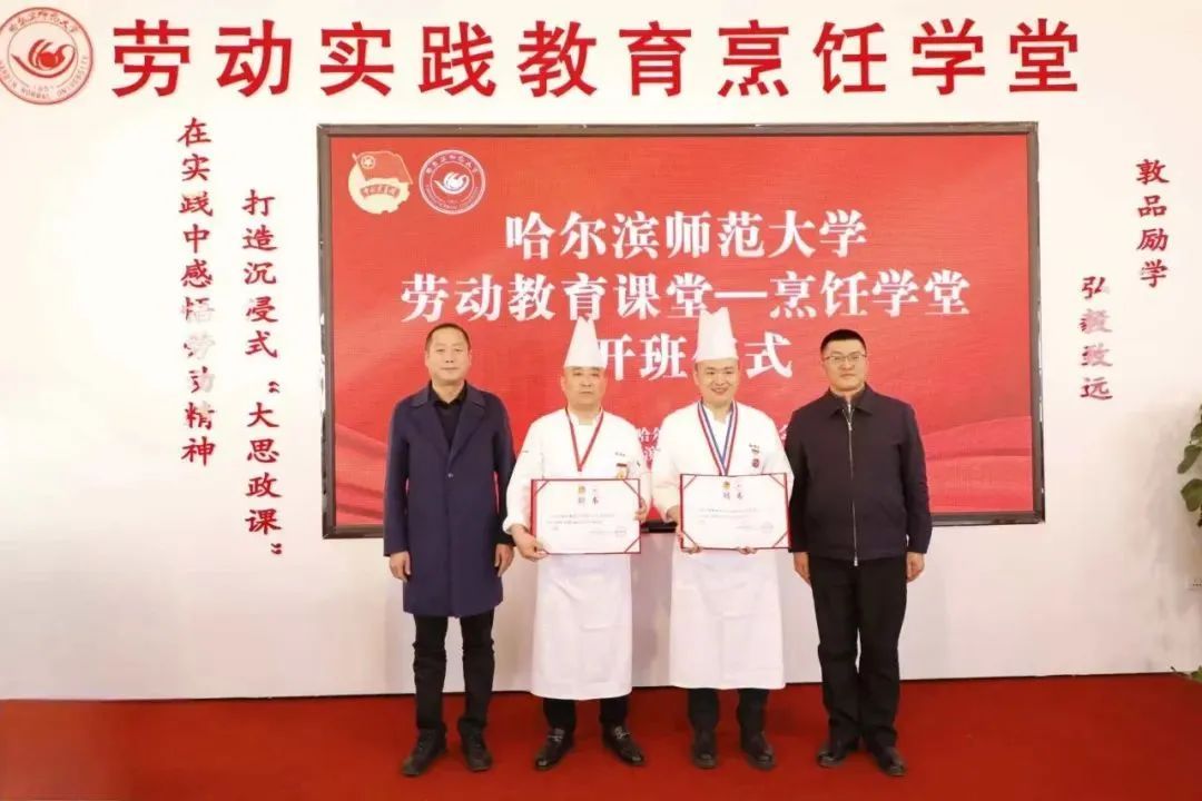 开班仪式上,校党委副书记、工会主席郭砾,党委常委、副校长尹剑锋为“拼搏在线登录劳动教育课堂”和“烹饪学堂”揭牌。产业处党委书记刘春秀、处长穆春勇为培训班讲师代表颁发聘书。