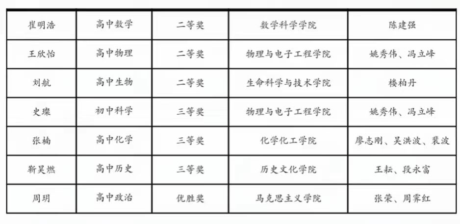 “田家炳杯”全国师范院校师范生教学技能竞赛是以交流师范生培养经验、促进师范生教学能力提升、培养优秀教师后备力量为目标的专业比赛,是目前本科师范生教学技能培养领域影响力最大的全国性赛事。经初赛评审,12月15日公布了入围现场决赛的149所高校的485名选手,同时评出三等奖485名、优胜奖242名。我校化学专业张楠、历史专业靳吴燃、物理学专业史璨获三等奖,思想政治教育专业周玥获优胜奖。地理科学专业黄茜雯、数学与应用数学专业崔明浩、物理学专业王欣怡和生物科学专业刘航四位选手入围决赛。