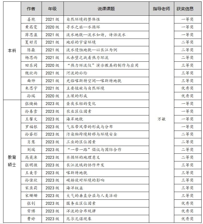 (万敏/文)2024年1月12日,由教育部地理专业虚拟教研室联合《地理教育》编辑部和北京中教启星科技股份有限公司北斗启星网络地理社区举办的首届说课大赛成绩揭晓,我校教师教育学院万敏老师指导的11名本科生和16名研究生参赛并获奖。首届地理说课大赛共收到来自全国各地高校教师、中学教师、研究生、本科生等作品744件,经过组委会专家评审,最终“本科组”评选一等奖22项,二等奖43项,三等奖65项,优秀奖85项;“硕士组”评选一等奖33项,二等奖67项,三等奖99项,优秀奖118项。我校地理科学学院本科生11人参赛,获得一等奖3项、二等奖3项、三等奖3项、优秀奖2项;教师教育学院学科教学(地理)专业研究生16人参赛,获得一等奖4项、二等奖4项、三等奖5项、优秀奖3项,为学校赢得了荣誉。27名参赛同学获奖信息如下: