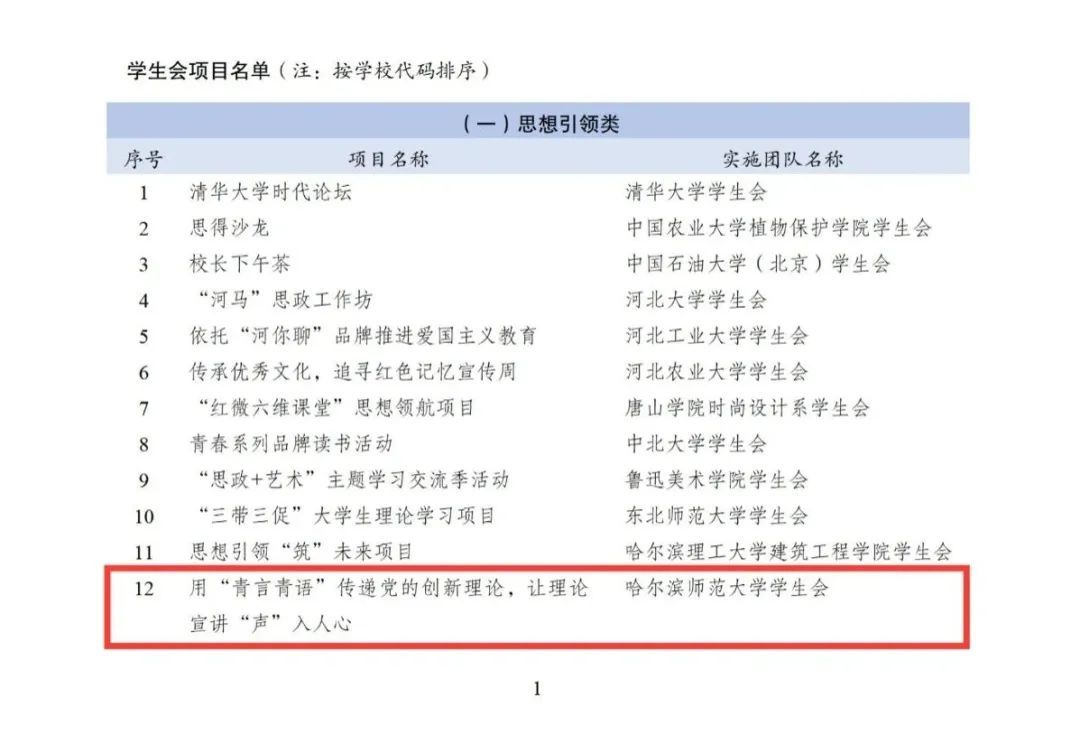 本次活动经学校自荐、省级推报、全国遴选,共产生清华大学等普通本科院校学生会项目182个,北京师范大学等研究生会项目62个。在我校团委的指导下,我校学生会和研究生会申报的“用‘青言青语’传递党的创新理论,让理论宣讲‘声’入人心”项目和“科创绘蓝图,筑梦向未来”项目分别荣获思想引领类和就业创业类奖项。