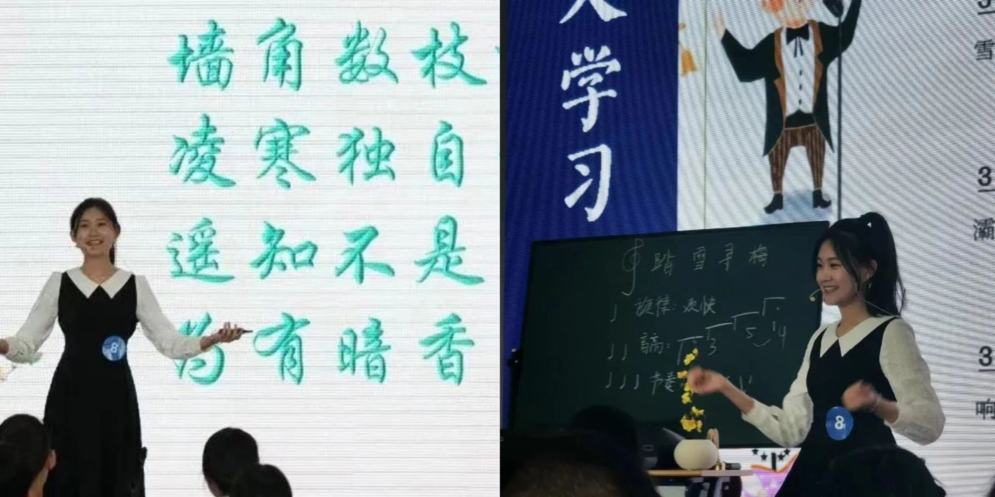 在师范类的技能比赛中,曹业炫是一名经验丰富的“种子选手”。她在本科阶段,就积极参加学校举办的各种师范类技能比赛并取得了优异的成绩。在研究生阶段,她继续坚持参赛,以高标准要求自己,在一次次比赛中,她逐渐意识到音乐课带给学生的不仅仅是音乐方面的知识,更多的是培养学生的音乐素养和审美能力,因此她反复修改教学设计、不断进行教学实践、锻炼和提高自己的教学技能、形成了具有个人特色的生动课堂。也因此她被学院的多位老师发现并推选参加了第四届全国师范院校未来教师素质大赛。