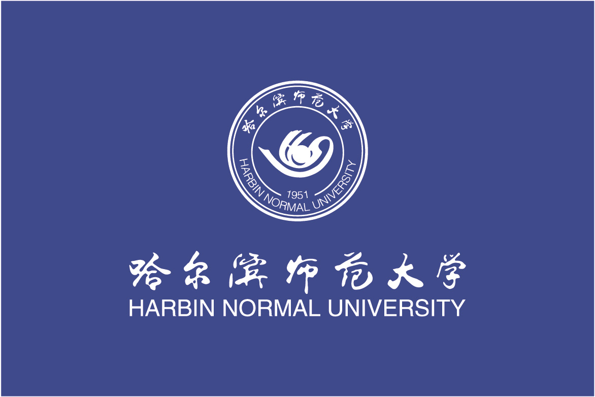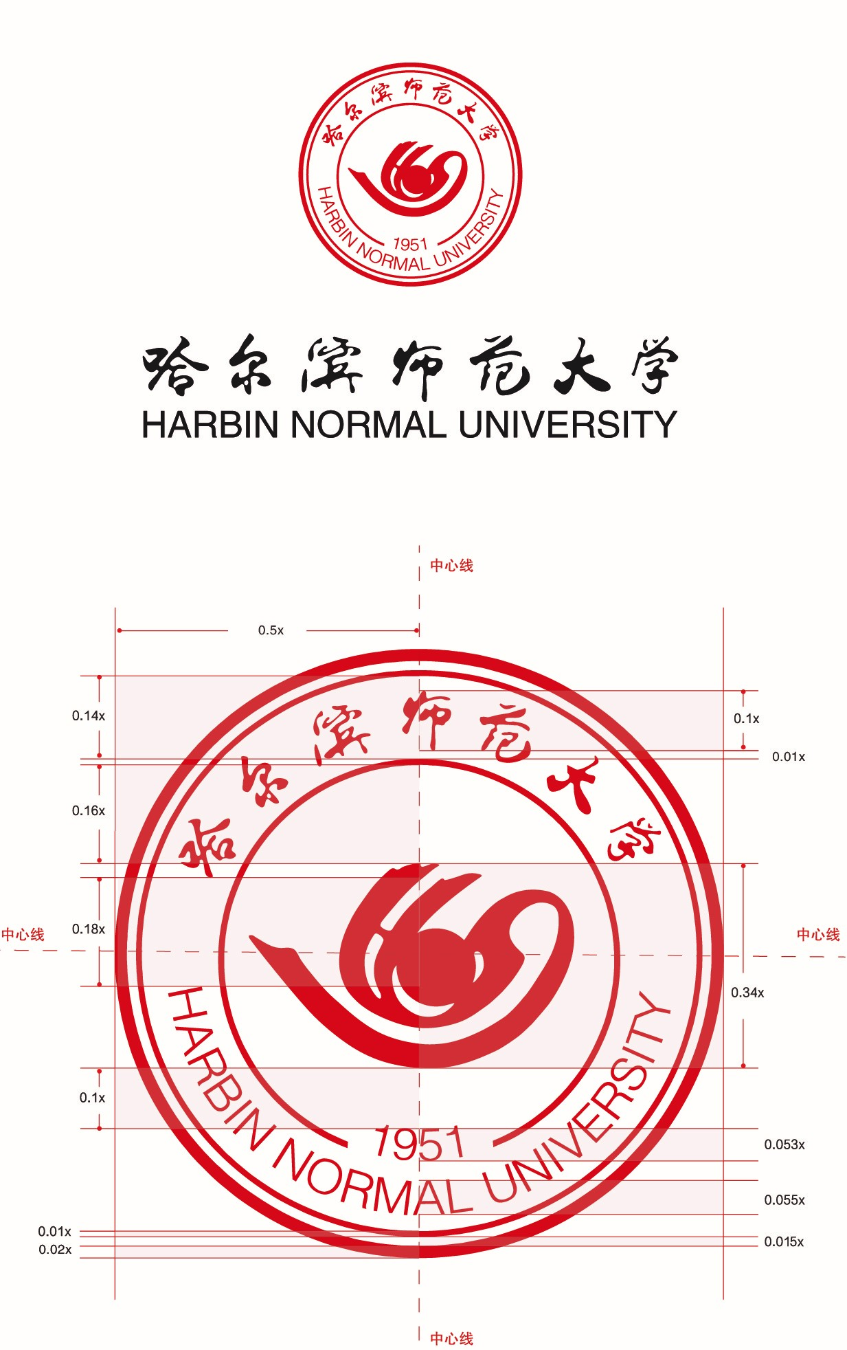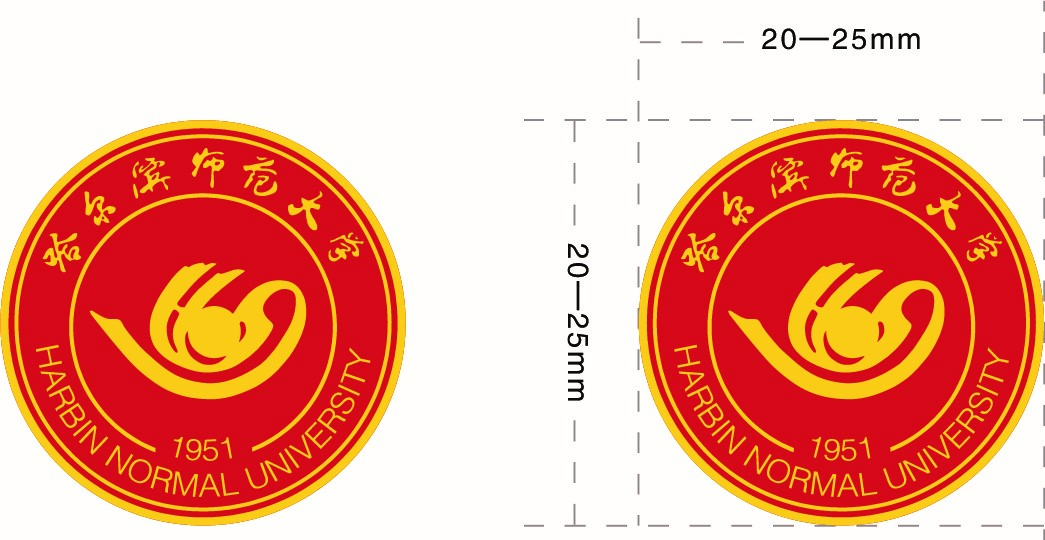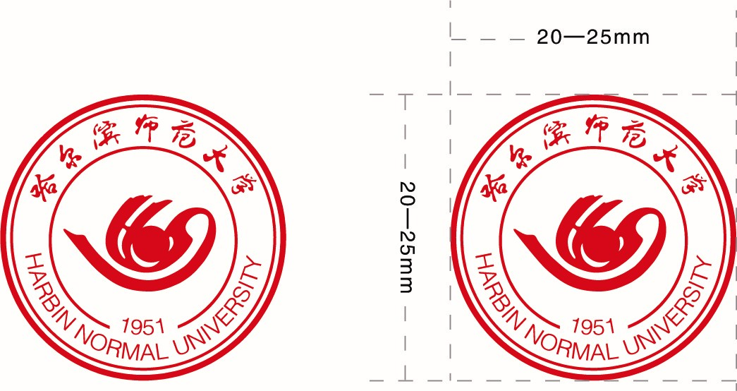 校标主体图案外部为红色圆形造型,内部是以“HSD”(“哈师大”汉语拼音第一个大写字母)变体抽象为的展翅高飞的天鹅图形、朝阳形象为基础的主体图案,外环上部为学校的中文名称,下部为校名英文全称“Harbin Normal University”,1951代表学校建校年份。