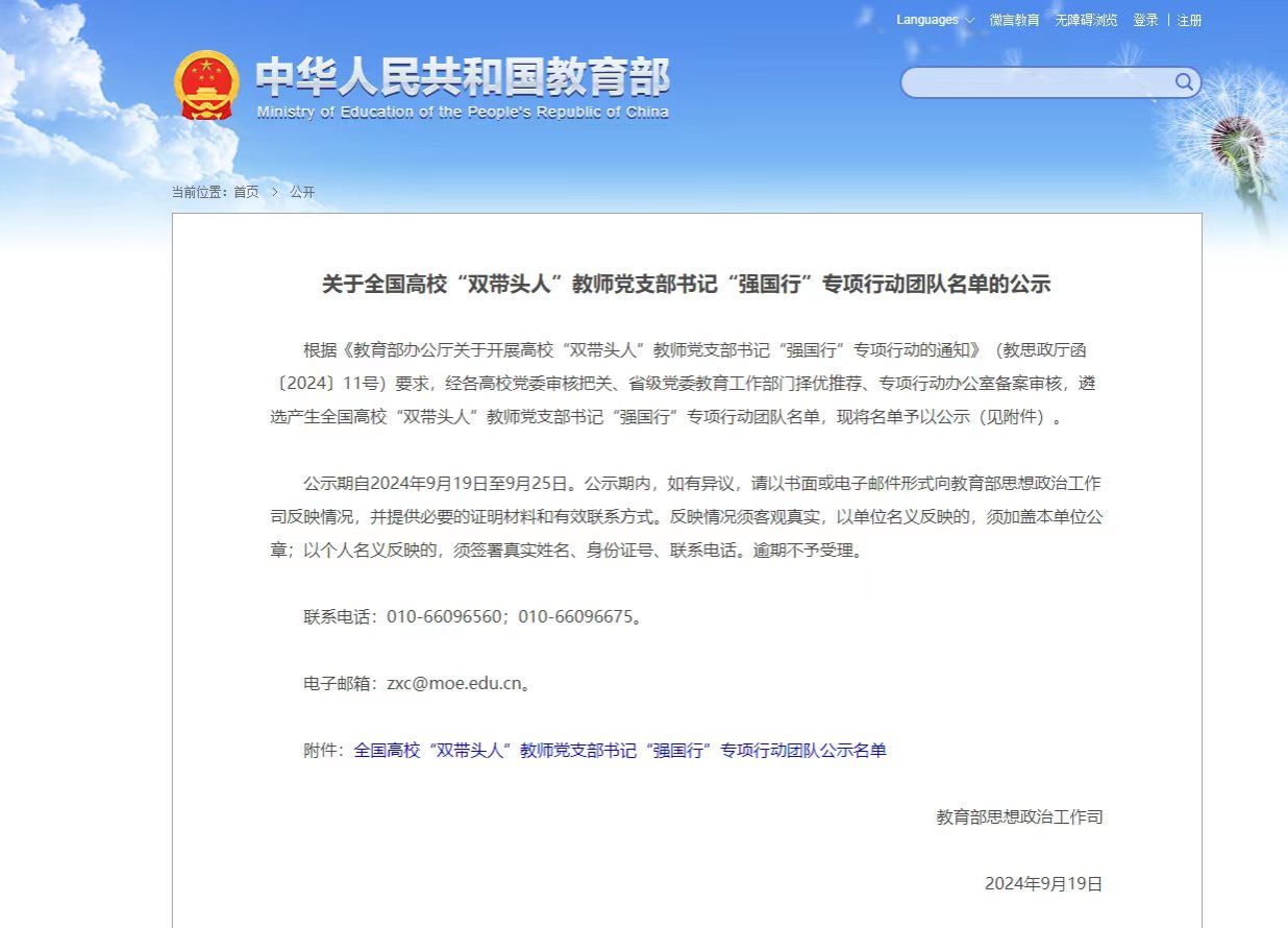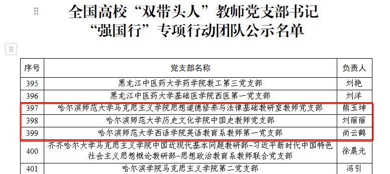 (刘佳鑫/文)近日,教育部办公厅公布《关于全国高校“双带头人”教师党支部书记“强国行”专项行动团队名单的公示》,我校马克思主义学院思想道德修养与法律基础教研室教师党支部、历史文化学院中国史教师党支部、西语学院英语教育系教师第一党支部3个支部成功入选。